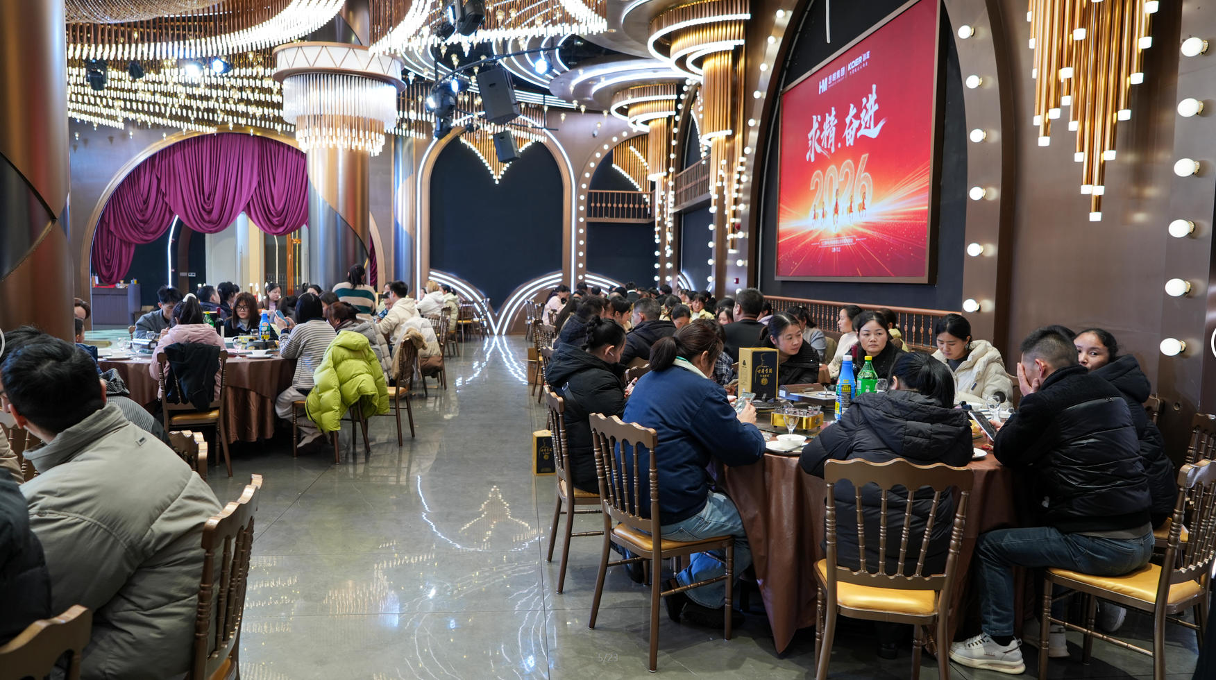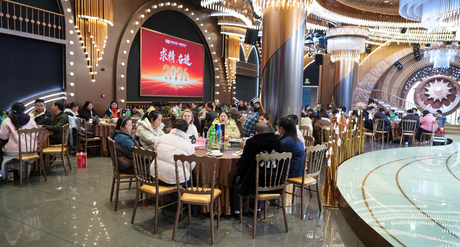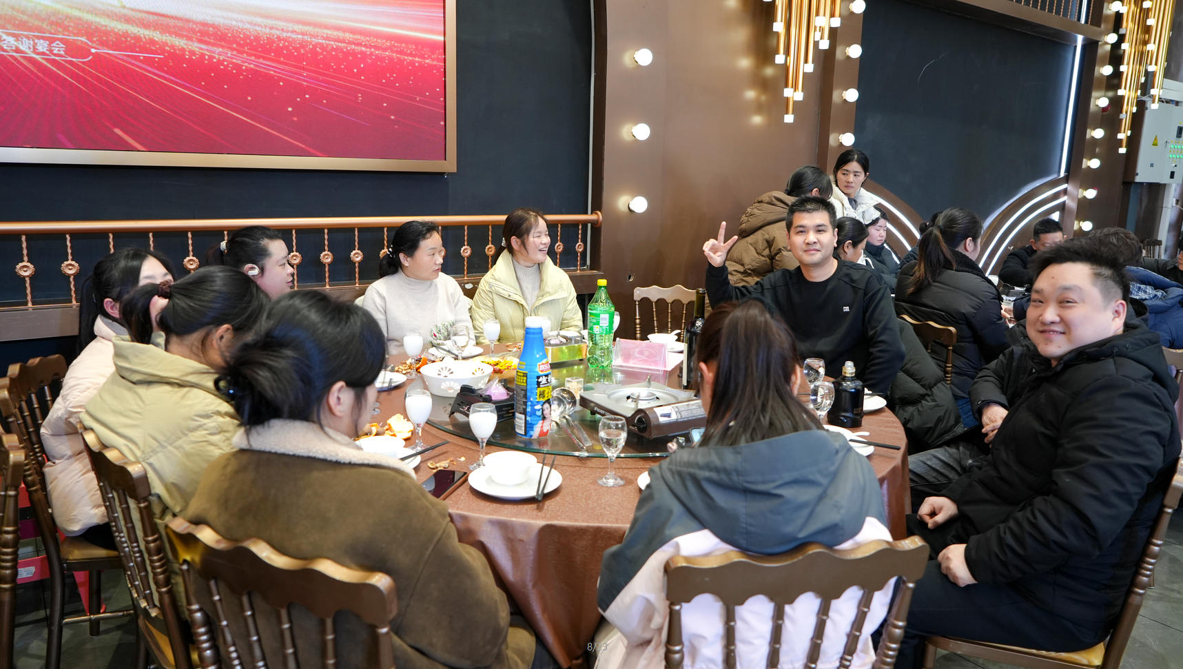 致辞结束后,欢乐的年宴正式开始。鎏金璀璨厅内,精心布置的灯光与红色主题装饰相得益彰,营造出浓厚的节日氛围。同事们围坐一起,品尝着丰盛的美味佳肴,推杯换盏间,平日忙碌的家人们卸下工作的疲惫,分享着生活中的趣事与对新年的期待。