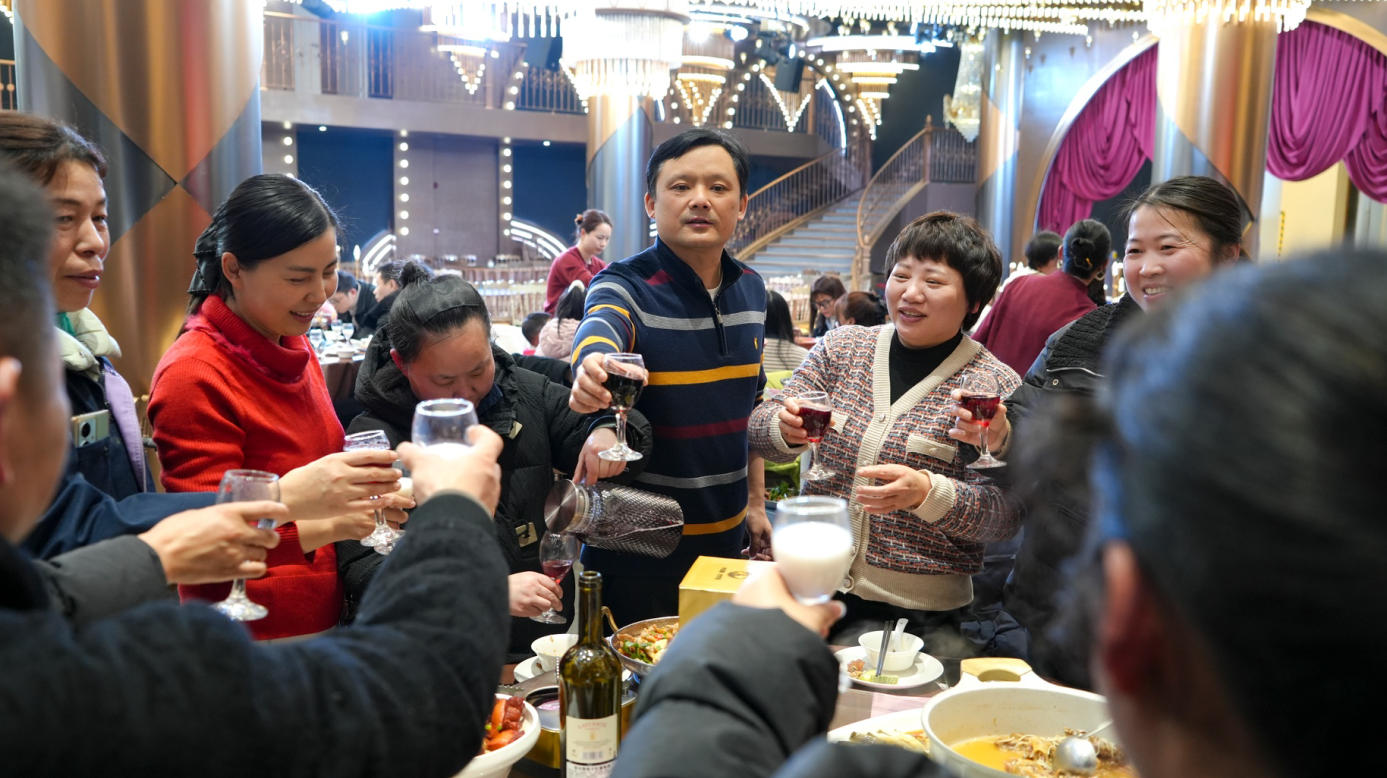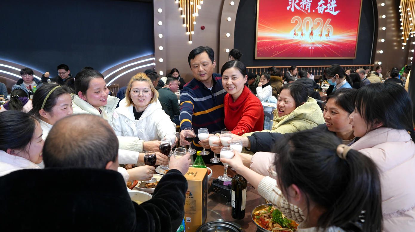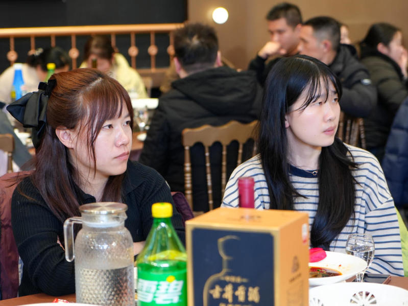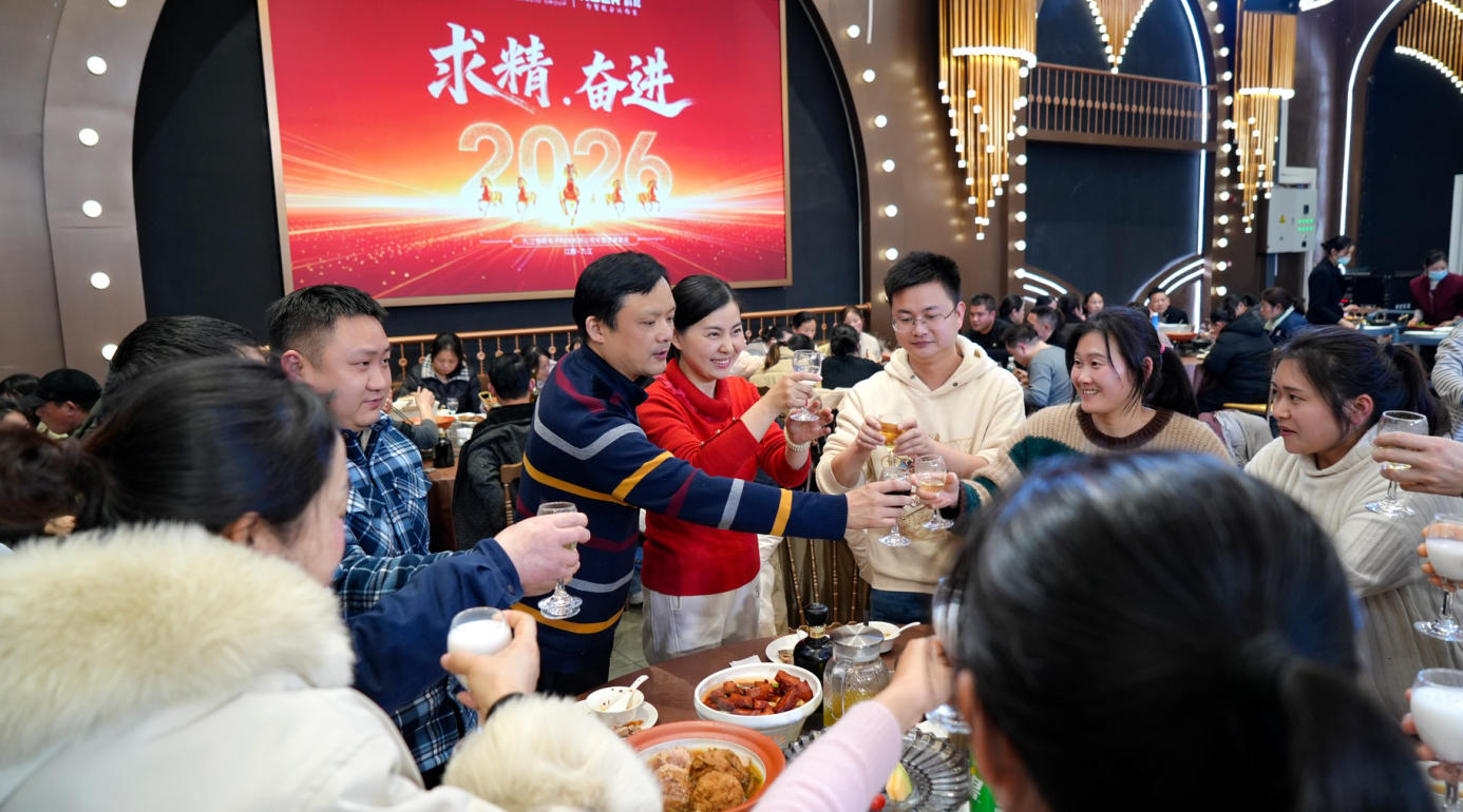 致辞结束后,欢乐的年宴正式开始。鎏金璀璨厅内,精心布置的灯光与红色主题装饰相得益彰,营造出浓厚的节日氛围。同事们围坐一起,品尝着丰盛的美味佳肴,推杯换盏间,平日忙碌的家人们卸下工作的疲惫,分享着生活中的趣事与对新年的期待。